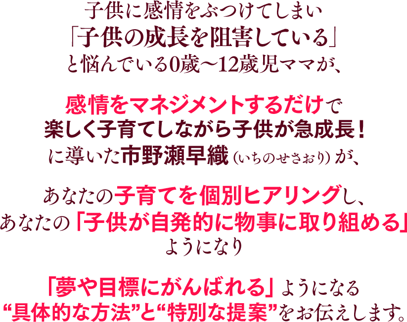 あなたの日々の子育てに取り入れるだけで、子供の成長を阻害することなく子供が自発的に行動できるようになる方法が分かる動画セミナーです。